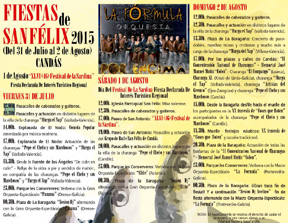 El viernes 31 de Julio de 2015 comienzan las Fiestas de San Félix de Candás, con un programa diverso y variado, que seguro sea del agrado de muchos, en el la tradición, la cultura, la música, la gastronomía y la fiesta se “funden” para ofrecer a vecinos y visitantes tres días de mucha fiesta a orillas del Cantábrico